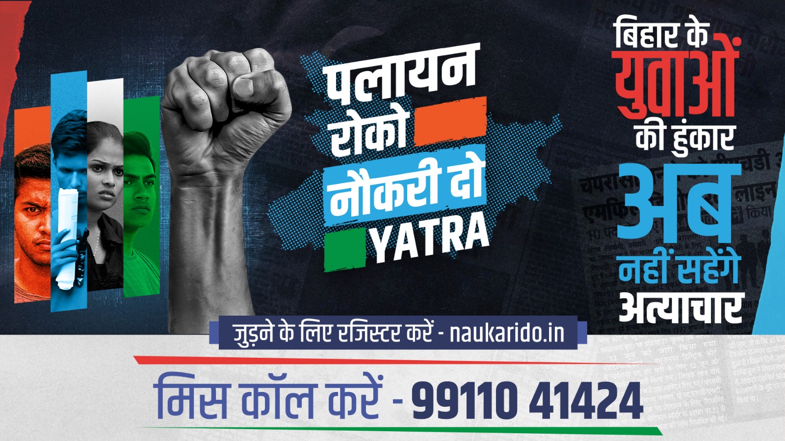 पलायन रोको नौकरी दो यात्रा बेरोज़गार युवाओं के अधिकारों के लिए एक जन आंदोलन है। यह लंबी यात्रा बिहार के कोने-कोने में जाकर युवाओं से संवाद कर रही है, उनकी समस्याओं को सुन रही है और उन्हें इस निर्णायक लड़ाई से जोड़ रही है। बिहार के युवा आज पलायन करने को मजबूर हैं क्योंकि राज्य में रोजगार के अवसर नहीं हैं। नरेंद्र मोदी और नीतीश कुमार की सरकार से युवा जवाब और अपना हक मांग रहे हैं।